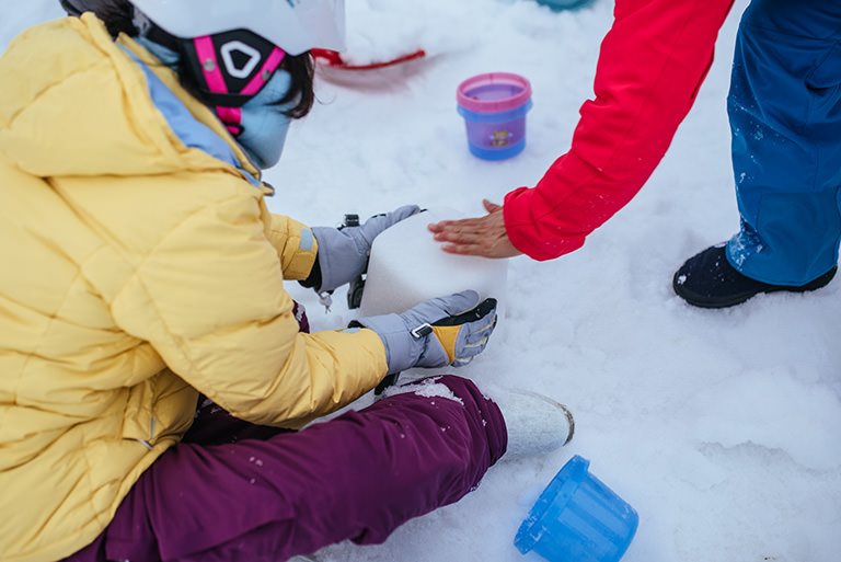 - 準備をほとんど必要としない「ストック神経衰弱」などの手軽にできる遊びから、スノーソーやスコップ、ソリなどの道具を使ったものまで沢山の雪上のアクティビティを楽しく体験します。
